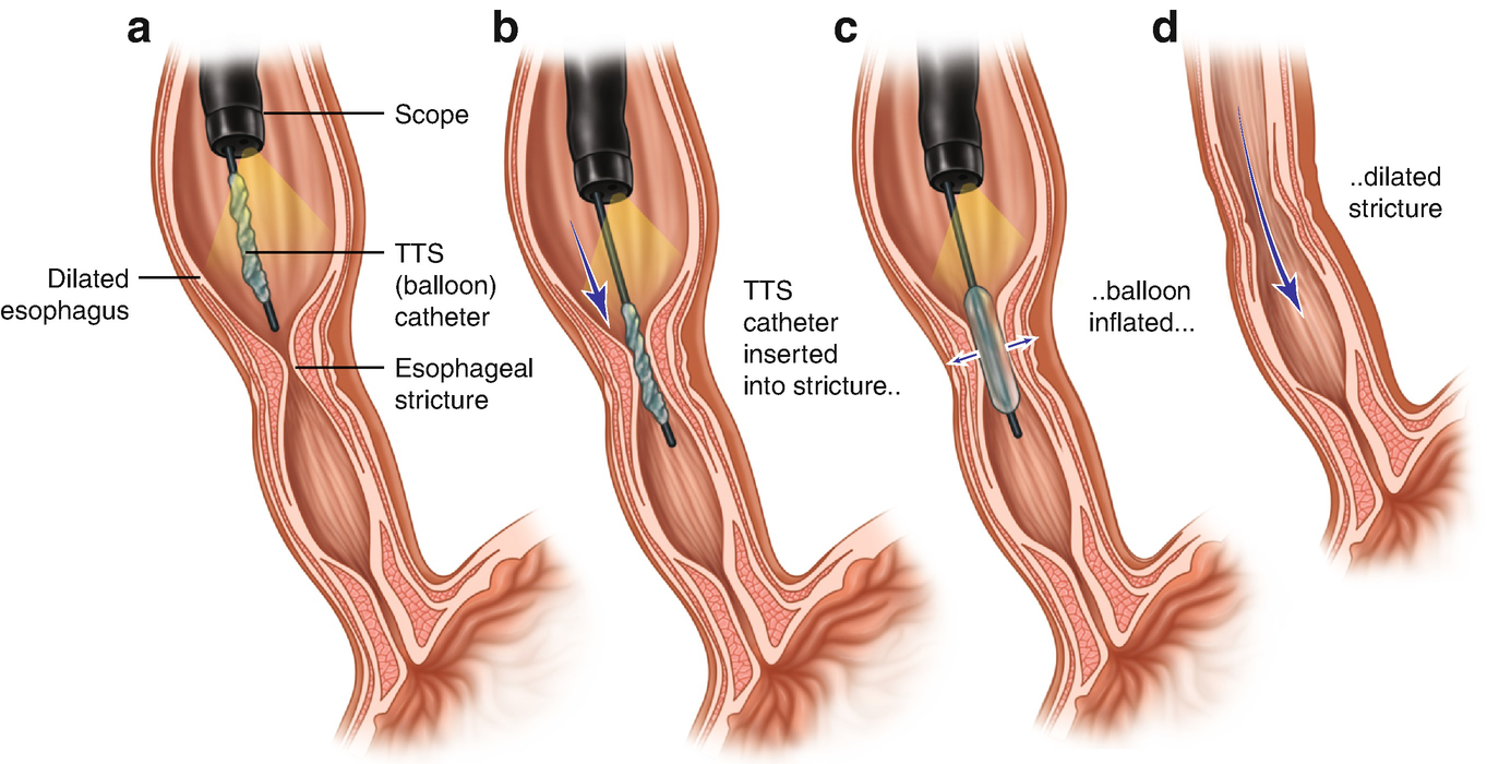 Depending on the size and the location of the narrowing, doctors may use different types of balloons (inflated with water or air) or rubber bougies to expand the size of the esophagus or other organ.